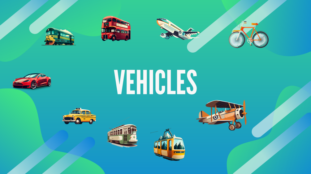 List of vehicles: airplane, bicycle, biplane, boat, bulldozer, cablecar, campervan, fighter jet, helicopter, highspeed train, London bus, motorbike, motor scooter, police car, rocket, school bus, SUV, taxi, tesla, train, tram, truck, fire truck